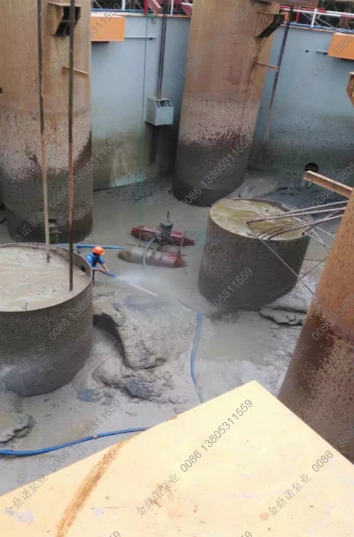 客戶之前采用的方式是用立式泥漿泵,配套高壓水槍,來抽取樁之間的泥漿,使用這種辦法有利有弊,利是立式泥漿泵配套浮筒使用,移動(dòng)起來比較方便,同時(shí)使用多臺(tái)套立式泥漿泵操作,工作效率大大提高,弊就是單臺(tái)立式泥漿泵的流量較小,而且需要工人使用高壓水槍配合立式泥漿泵工作,要保證工期,須同時(shí)使用多臺(tái)套立式泥漿泵和高壓水泵,這就加大了投資成本,此外,遇到比較惡劣的地質(zhì),例如有黏泥層的環(huán)境,單靠高壓水槍作用太小,而使用鉸刀就不存在這樣的問題,比較硬的泥層,鉸刀的力量遠(yuǎn)遠(yuǎn)大于高壓水槍,同時(shí)鉸刀是和潛水泥沙泵同步使用的,這樣就大大節(jié)省了人工,總體成本降低。